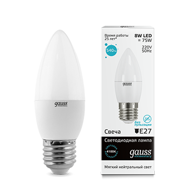 - Лампа светодиодная GAUSS Elementary Свеча 8W 540lm 4100K Е27 1/10/100 (33228)