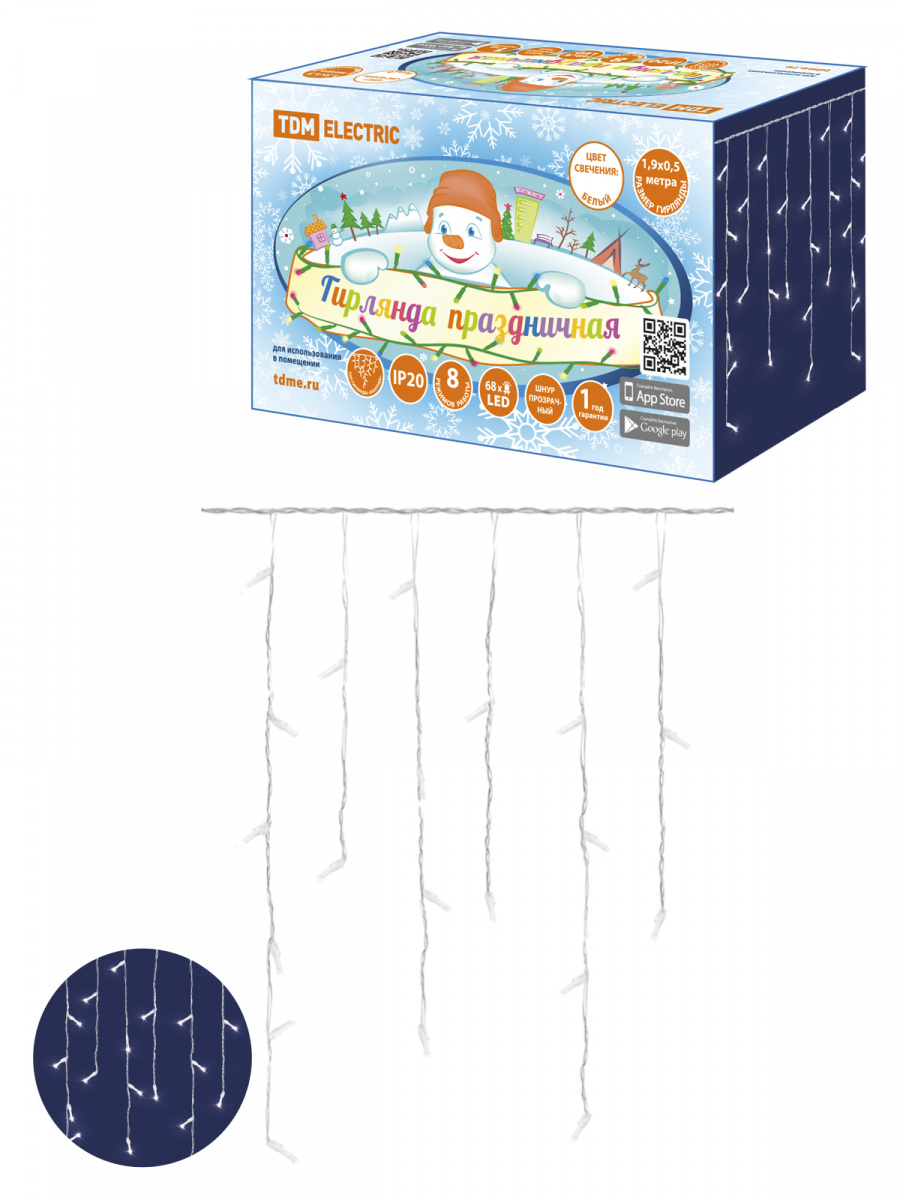 - Гирлянда светодиодная "Бахрома" 1,9х0,5 м, 68LED, белый, 8 режимов, 250 В, IP20, TDM (1/100) (SQ0361-0077)