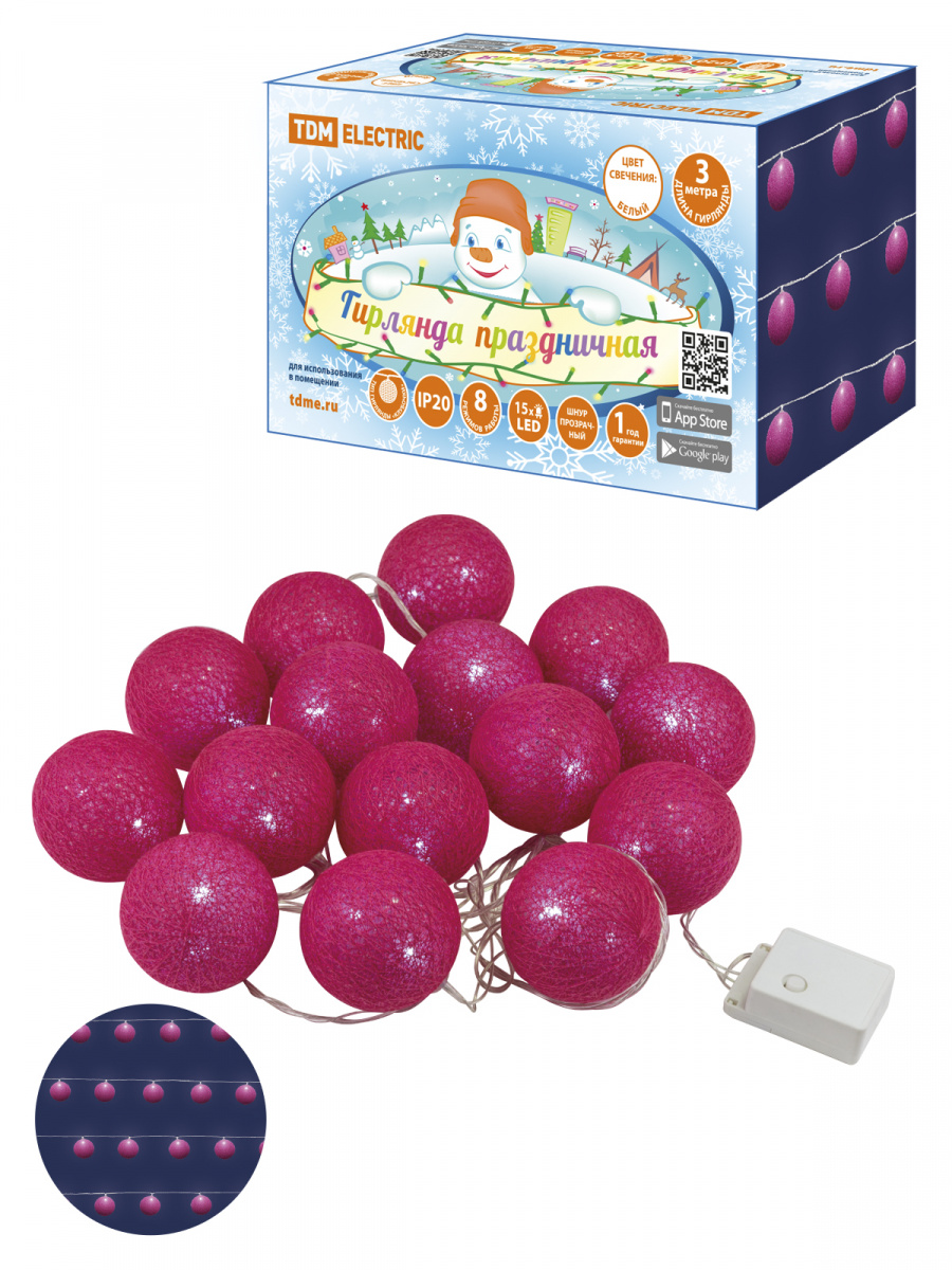 - Гирлянда светодиодная TDM "Клубочки" 3 м, 15LED, белый, 8 режимов, 250В, IP20, (1/24) (SQ0361-0094)