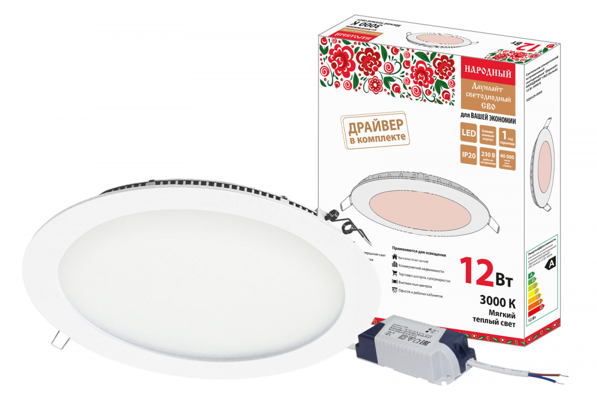 - Светильник светодиодный НАРОДНЫЙ " "Даунлайт" " СВО (белый) 12 Вт 3000К (1/1/40) (SQ0329-0095)