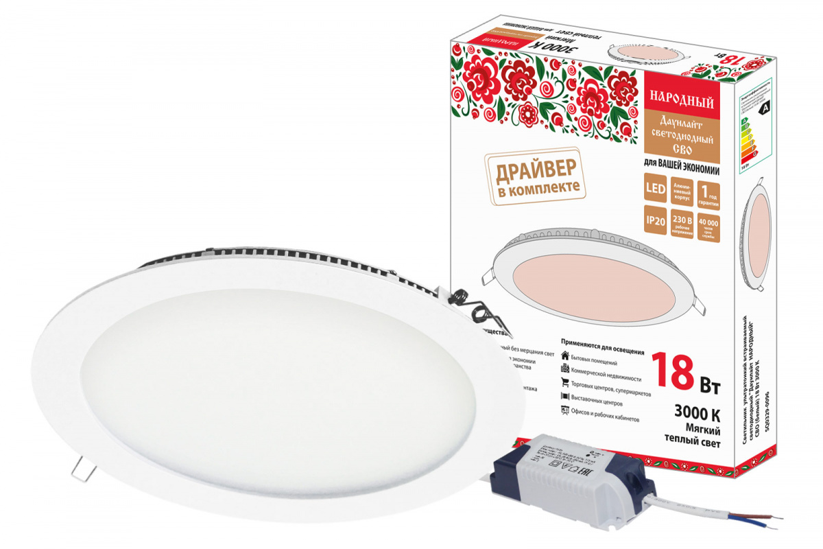 - Светильник светодиодный НАРОДНЫЙ " "Даунлайт" " СВО (белый) 18 Вт 3000К (1/1/30) (SQ0329-0096)