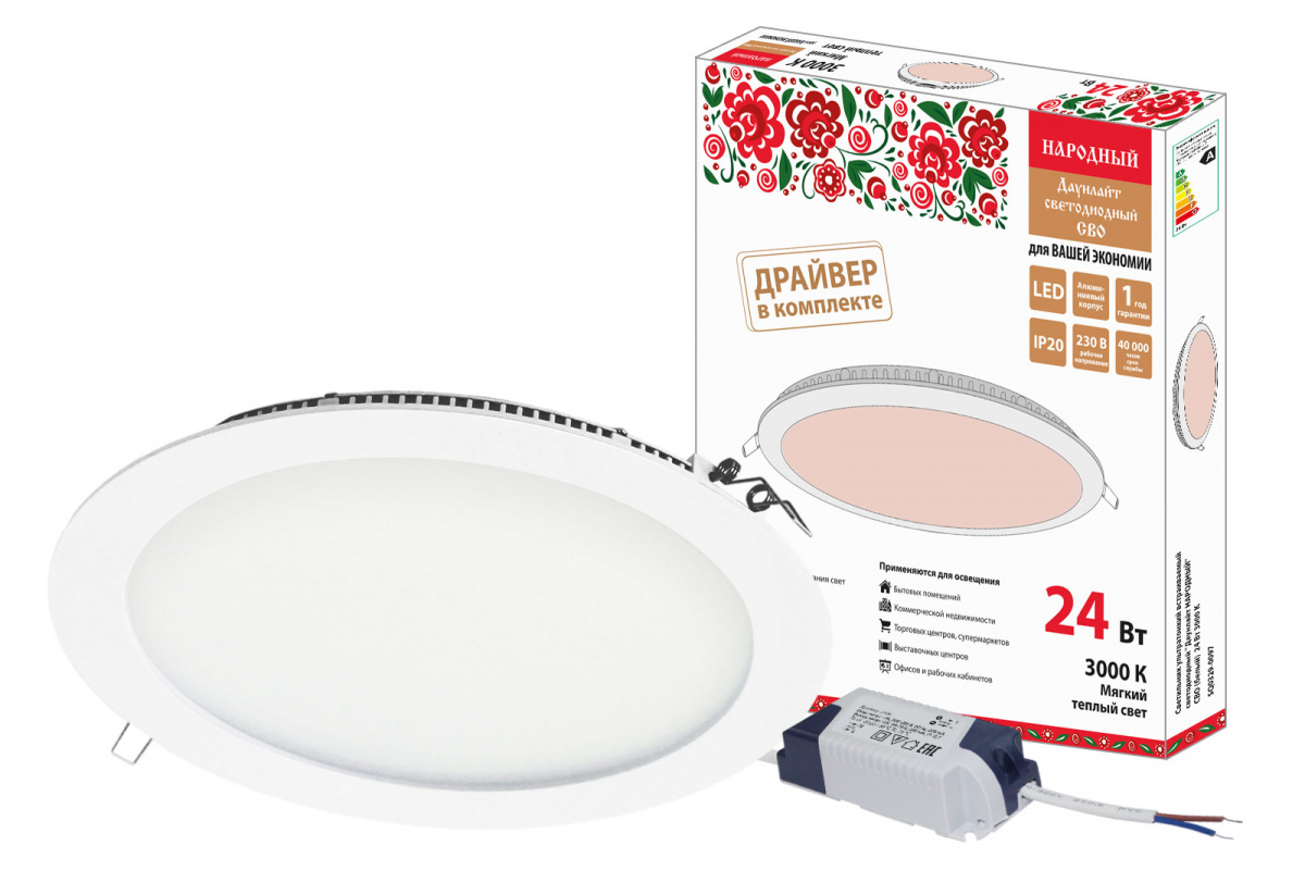 - Светильник светодиодный НАРОДНЫЙ " "Даунлайт" " СВО (белый) 24 Вт 3000К (1/1/15) (SQ0329-0097)