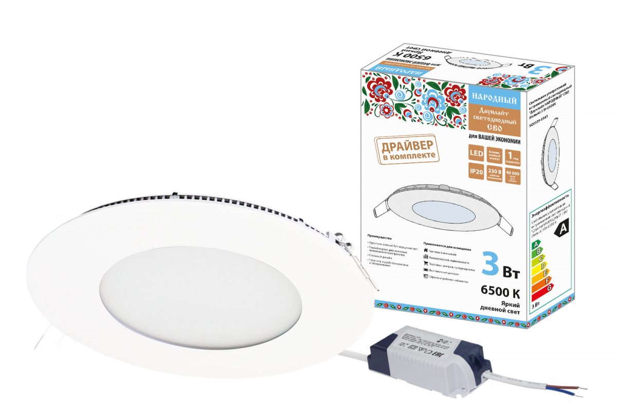 - Светильник светодиодный НАРОДНЫЙ ультратонкий встраиваемый " "Даунлайт" " СВО (белый) 3 Вт 6500К (1/1/50 (SQ0329-0545)