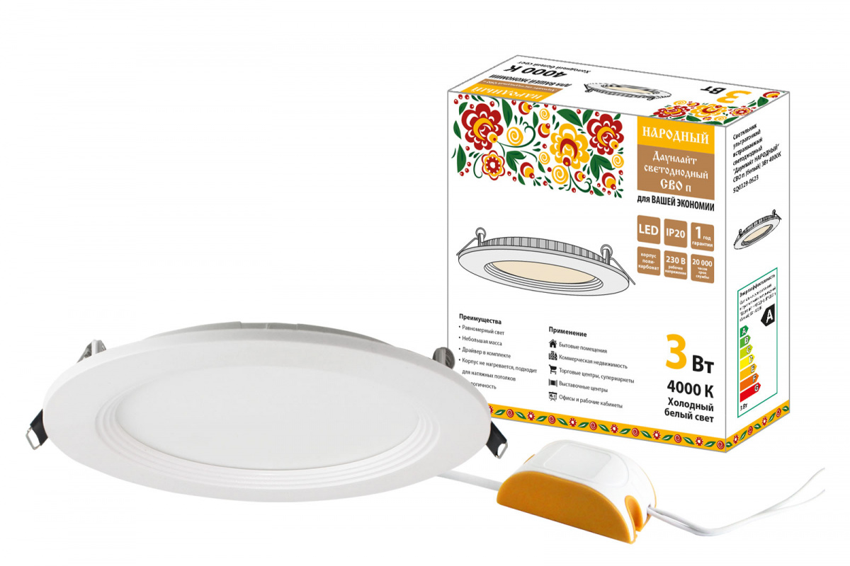 - Светильник светодиодный НАРОДНЫЙ ультратонкий встраиваемый " "Даунлайт" " СВО п (белый) 3Вт 4000К (1/100) (SQ0329-0523)