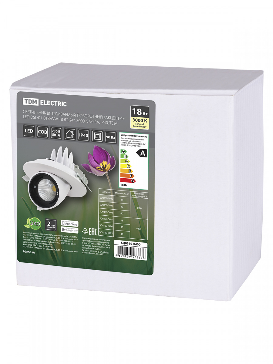 - Светильник светодиодный TDM встраиваемый поворотный "Акцент-1" DSL-01-018-WW 18 Вт, 24°, 3000 К, 90 Ra, IP40, (1/40) (SQ0369-0400)