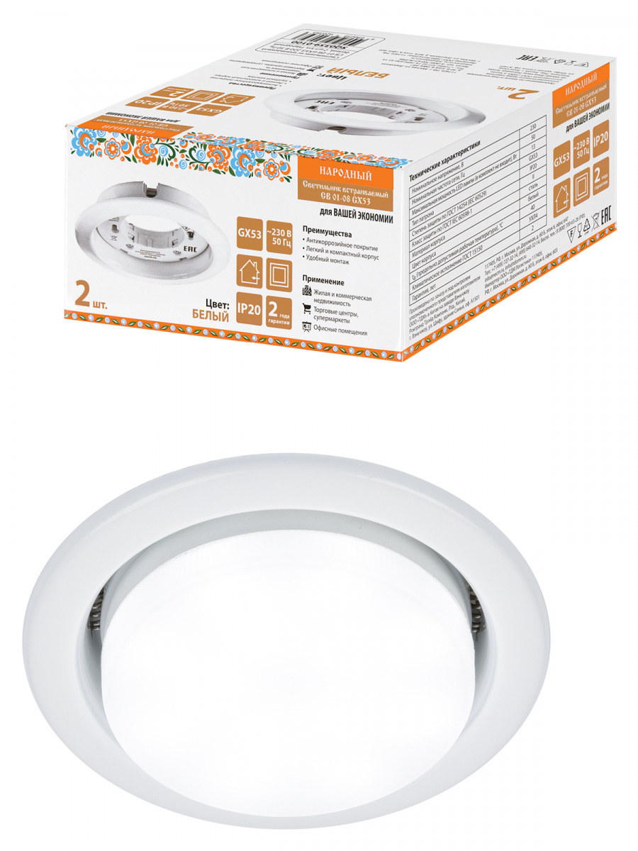 - Светильник встраиваемый СВ 01-08 GX53 220 В 50 Гц, белый, 2 шт/уп, Народный (10/50) (SQ0359-0100)