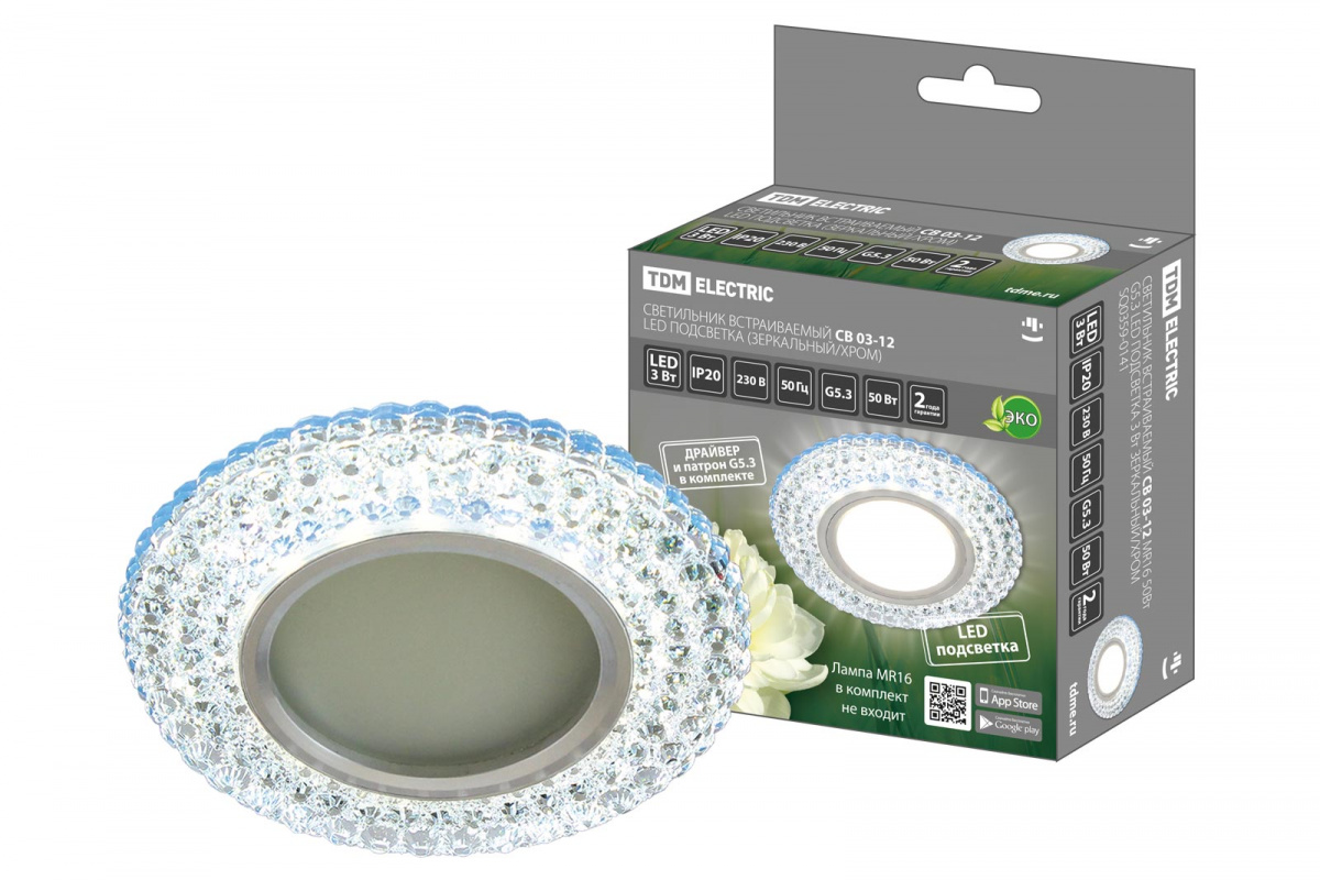 - Светильник светодиодный TDM встраиваемый СВ 03-12 MR16 50Вт G5.3 подсветка 3 Вт зеркальный/хром (1/10/100) (SQ0359-0141)