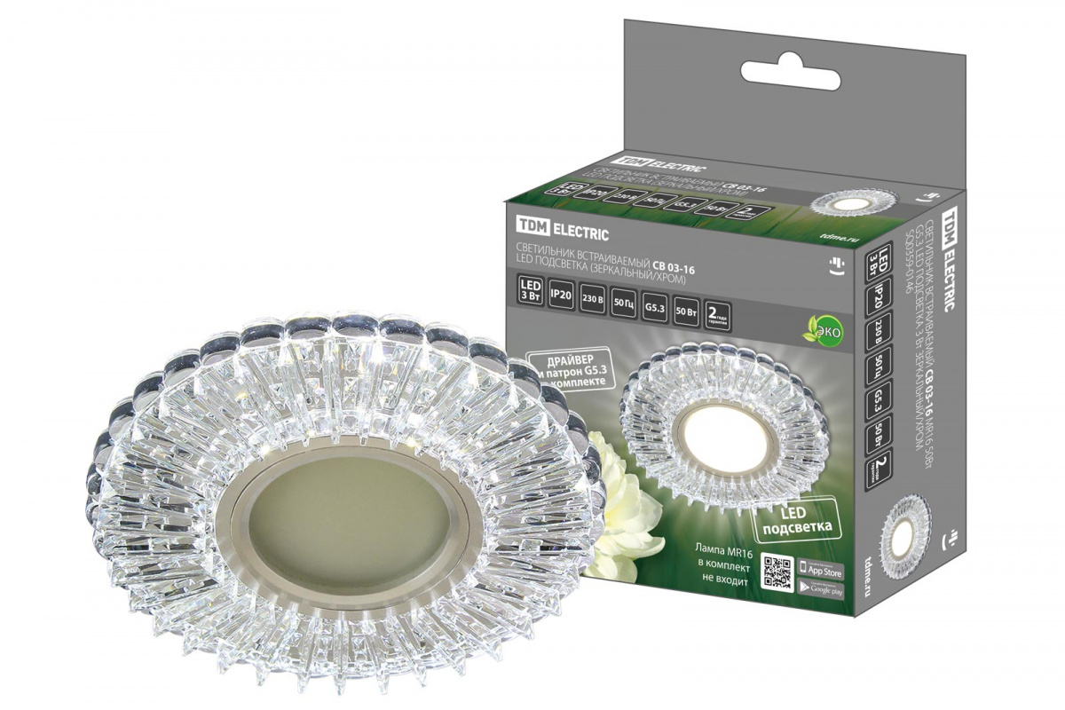 - Светильник светодиодный TDM встраиваемый СВ 03-16 MR16 50Вт G5.3 подсветка 3 Вт зеркальный/хром (1/10/50) (SQ0359-0146)