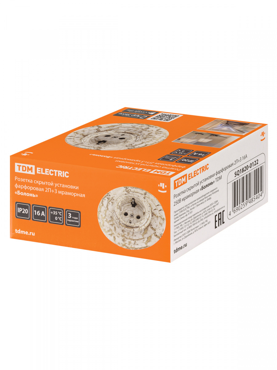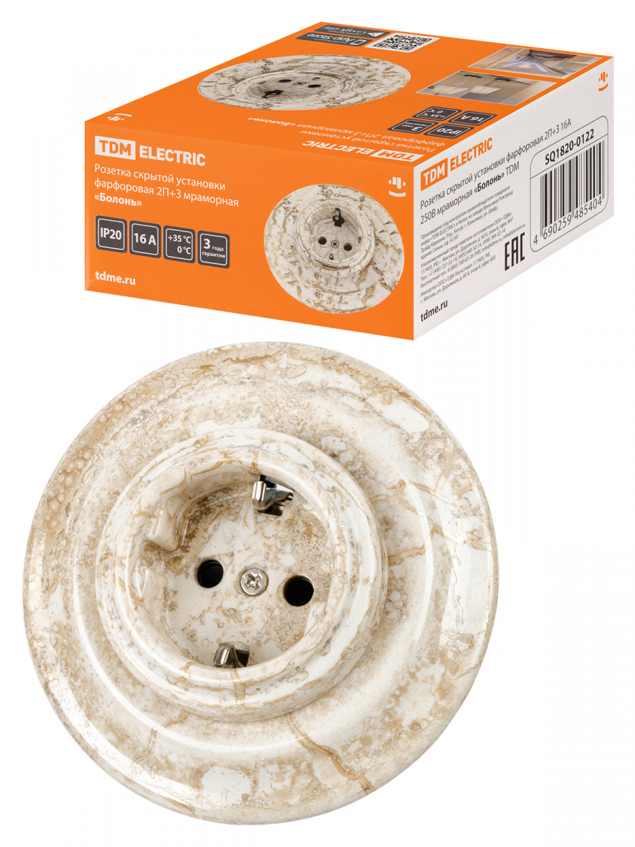 - Розетка TDM скрытой установки фарфоровая 2П+З 16А 250В мраморная «Болонь» (1/36) (SQ1820-0122)