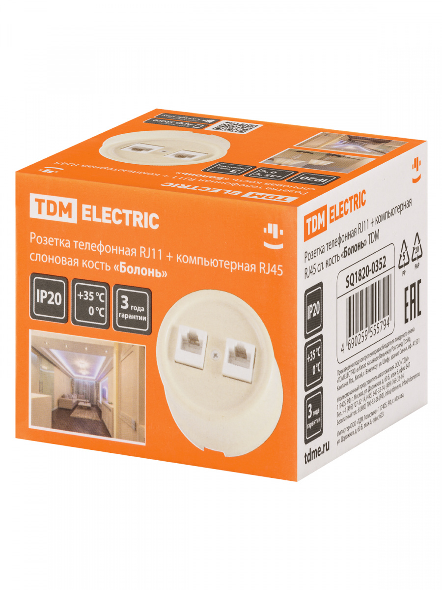 - Розетка TDM телефонная RJ11 + компьютерная RJ45 сл. кость «Болонь» (1/72) (SQ1820-0352)