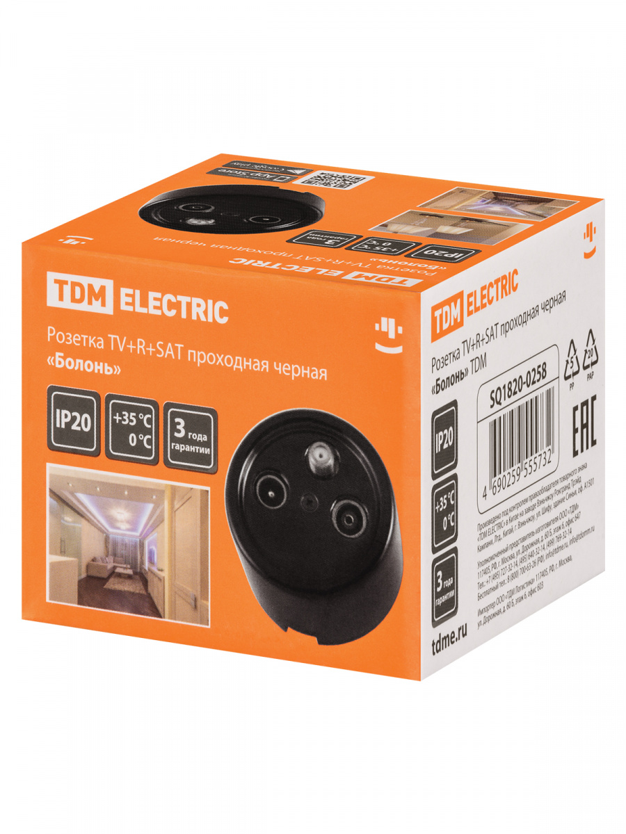 - Розетка TDM TV+R+ SAT проходная черная «Болонь» (1/72) (SQ1820-0258)