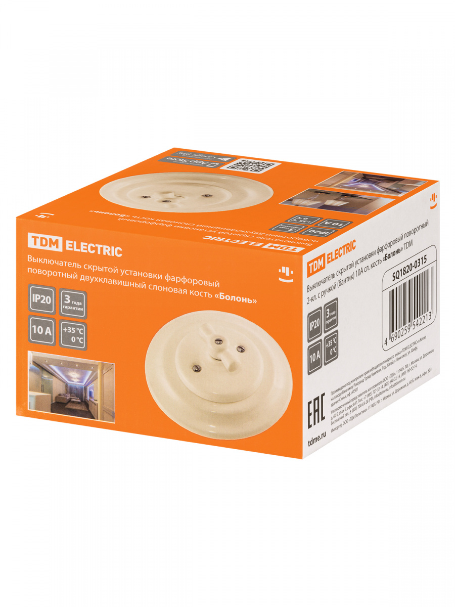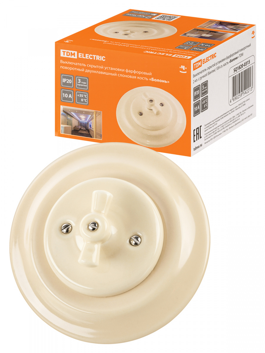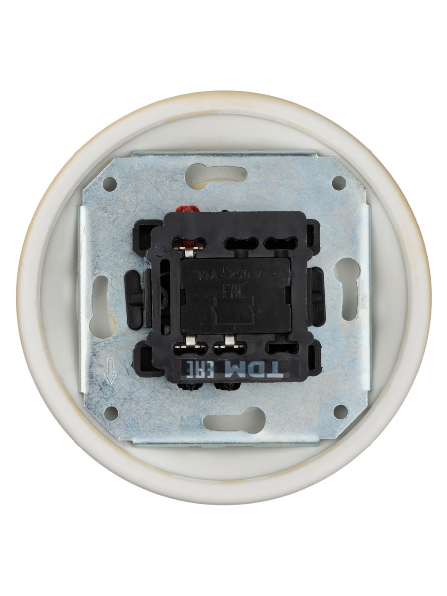 - Выключатель скрытой установки фарфоровый поворотный 2-кл. с ручкой (бантик) 10А сл. кость «Болонь» TDM (SQ1820-0315)