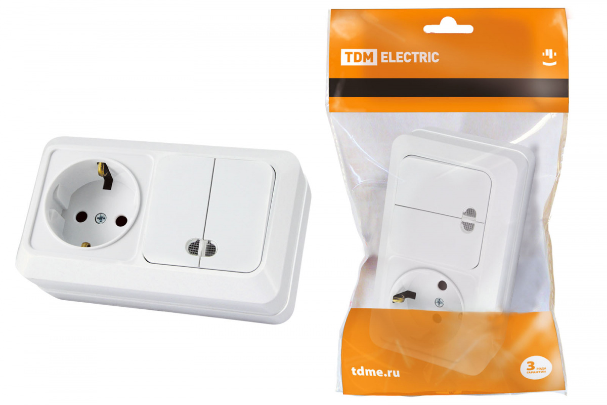 - Блок комбинированный выключатель 2-кл. 10А с подсветкой + розетка 2П+З 16А 250В БКВР IP20, ОУ, белый "Лад (SQ1801-0104)