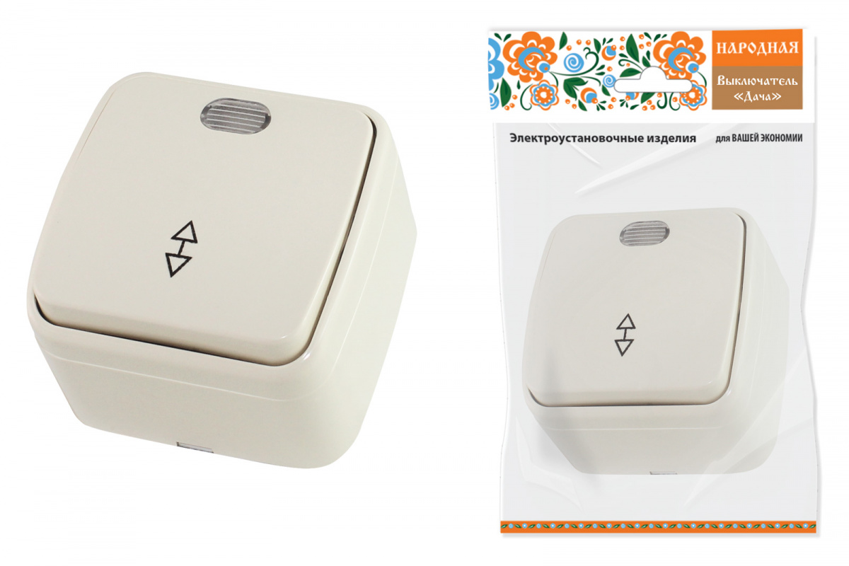 - Переключатель на 2 направления 1-кл. открытой устан с подсветкой IP20 10А, сл. кость "Дача" Народная (1/10/100) (SQ1824-0019)