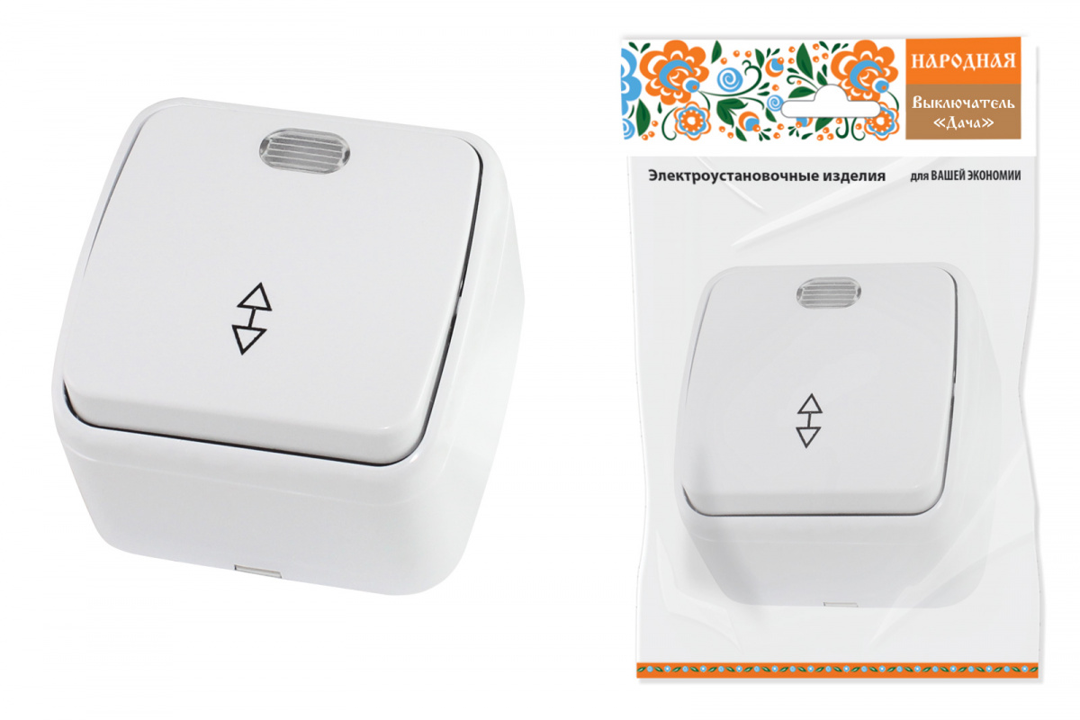- Переключатель на 2 направления 1-кл. открытой установки с подсветкой IP20 10А, белый "Дача" Народная (1/10/100) (SQ1824-0006)