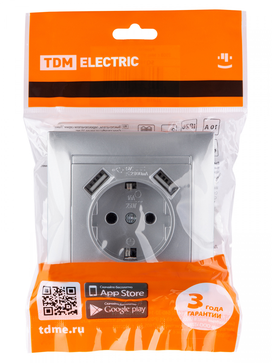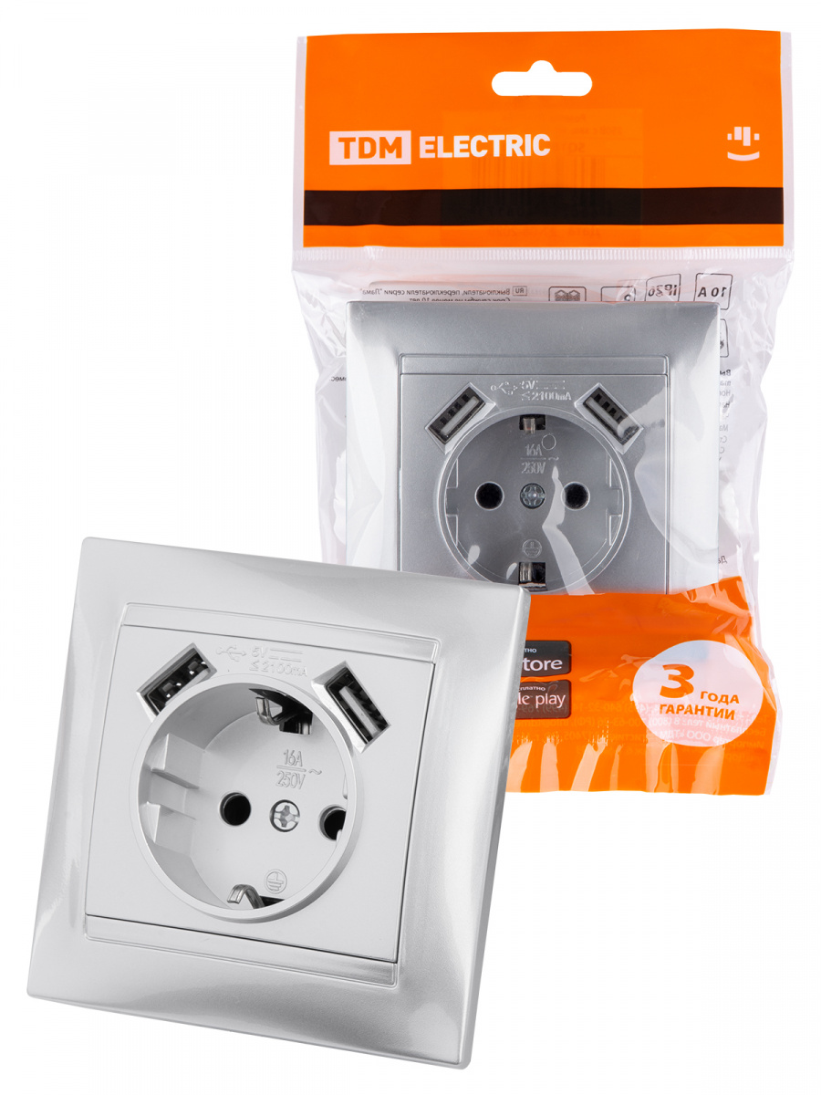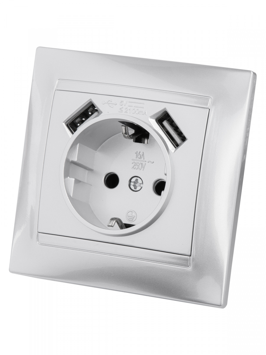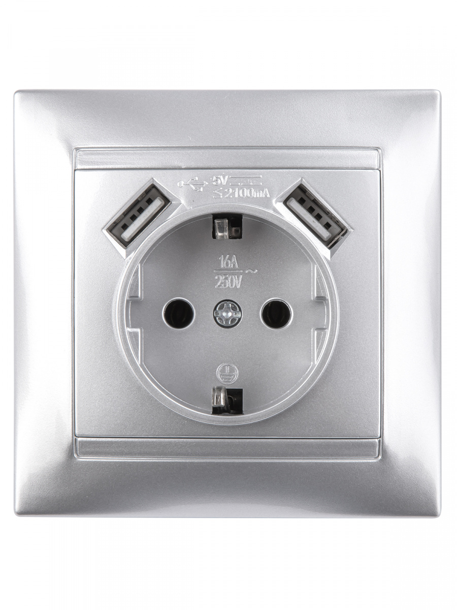 - Розетка 2П+З 16А 250В + 2 USB порта 2,1А 5В металлик с/у, "Лама" (1/96) TDM (SQ1815-0242)