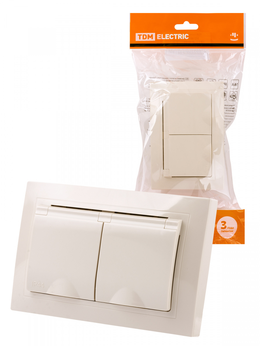 - Розетка двойная 2П+З с защ. шт. и крышкой 16А 250В IP44 сл. кость "Таймыр" (10/100) TDM (SQ1814-0176)