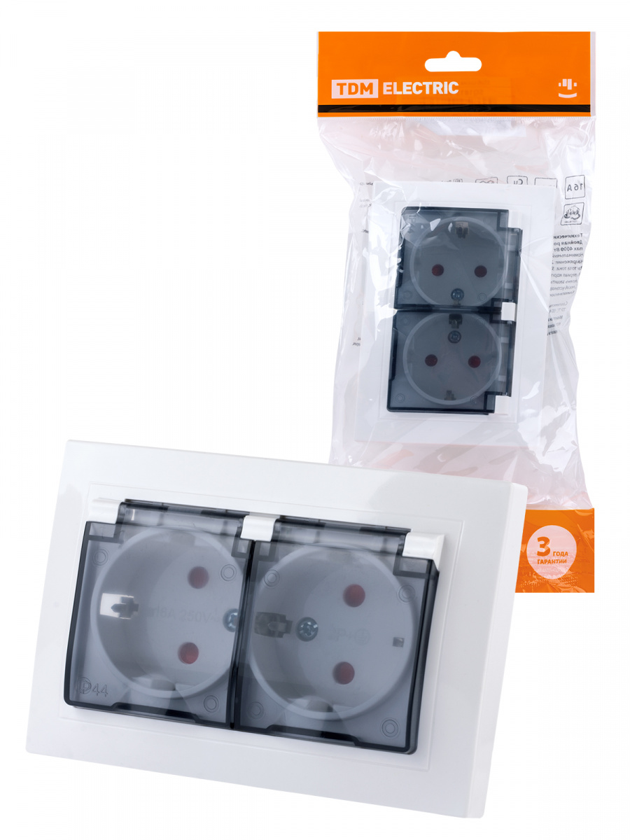 - Розетка двойная 2П+З с защ. шт. и прозрачной крышкой 16А 250В IP44 белая "Таймыр" (10/100) TDM (SQ1814-0077)