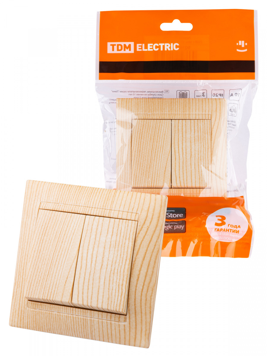 - Выключатель 2-х кл. 10А сосна , с/у, "Лама" (10/120) TDM (SQ1815-0302)