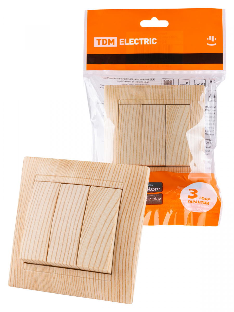- Выключатель 3-х кл. 10А сосна , с/у, "Лама" (10/120) TDM (SQ1815-0303)
