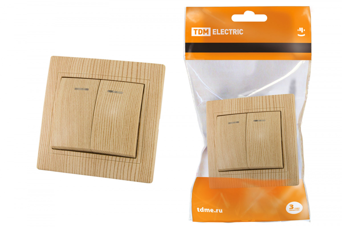 - Выключатель скрытая установка, 2 кл. с подсветкой 10А "ЭКО" (сосна) "Таймыр" TDM (10/100) (SQ1814-0205)