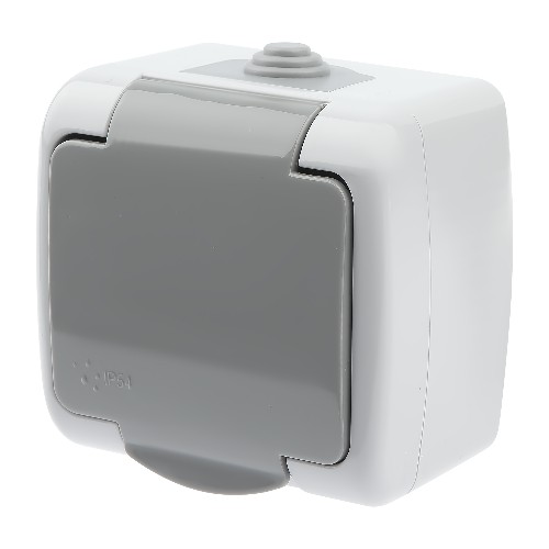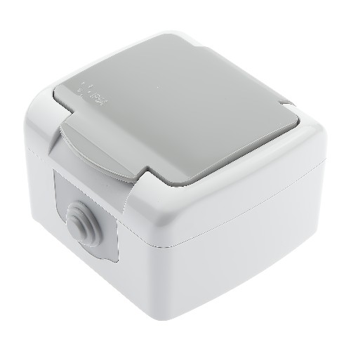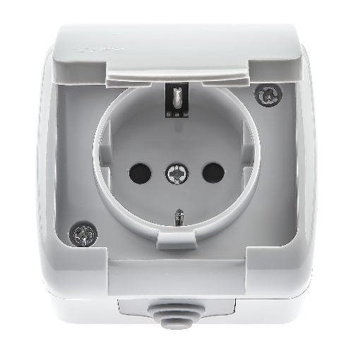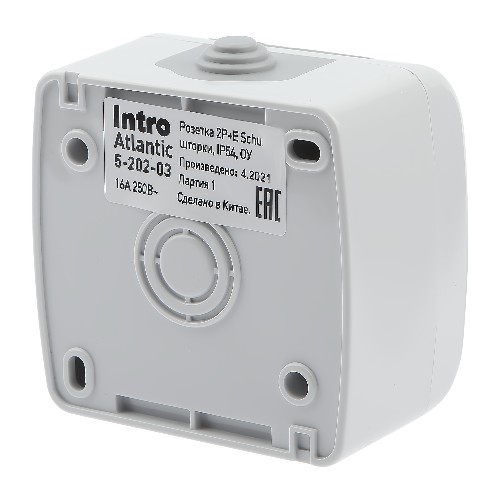 - Розетка INTRO Atlantic 5-202-03 с заземлением со шторками 2P+E Schuko, 16А-250В, IP54, открытой установки, серый (1/10/120) (Б0050946)