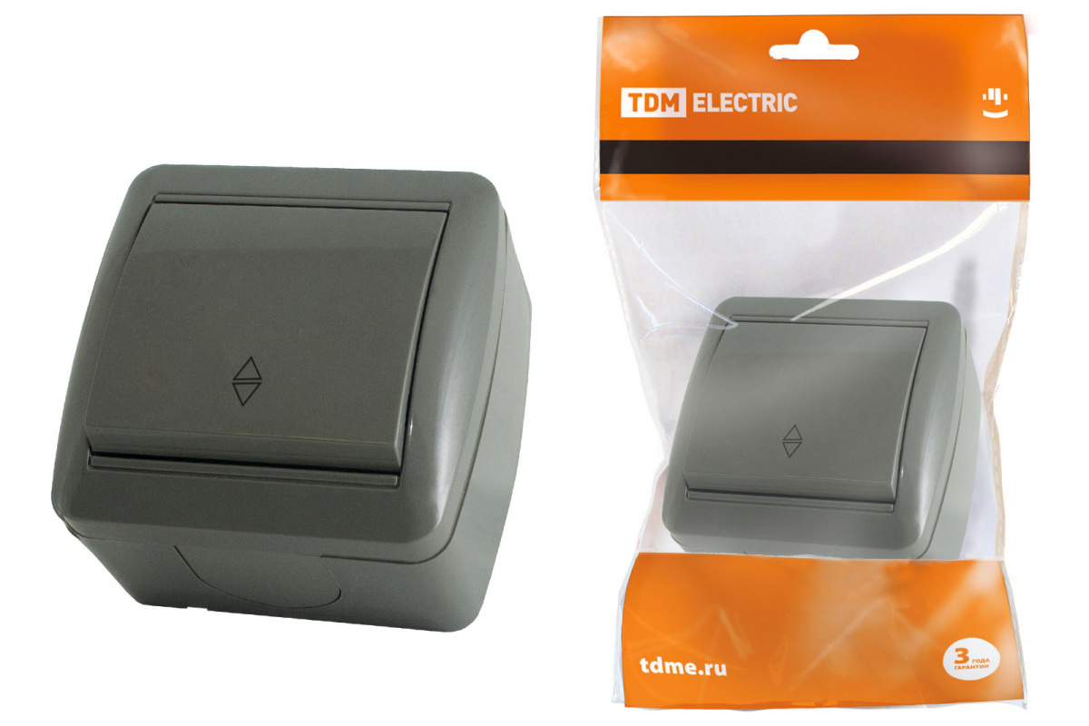 - Выключатель на 2 направления 1-кл. открытой установки IP44 10А серый "Селигер" TDM (1/10/120) (SQ1818-0111)