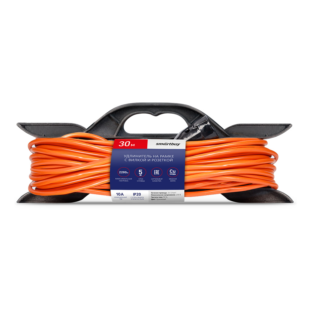 - Удлинитель SMARTBUY на рамке с вилкой и розеткой 10А, 30 метров 2х1,0 мм², оранжевый провод с вилкой и розеткой, IP20 (SBE-10-1-30-F) (1/6)