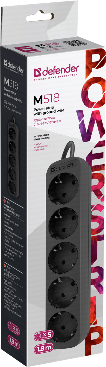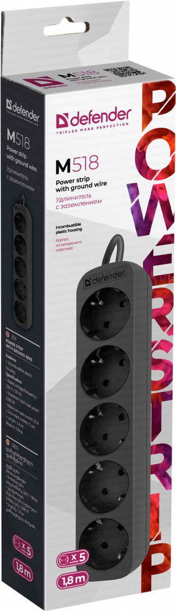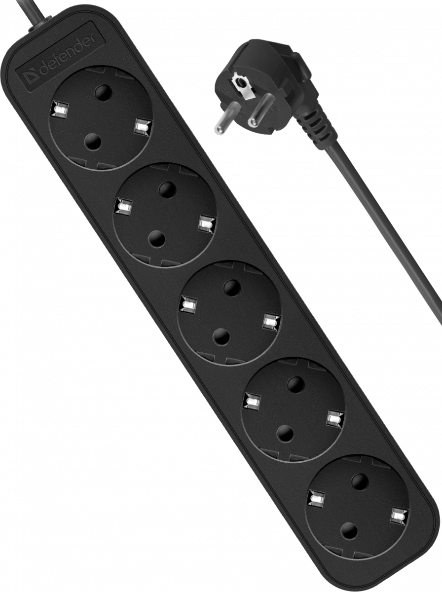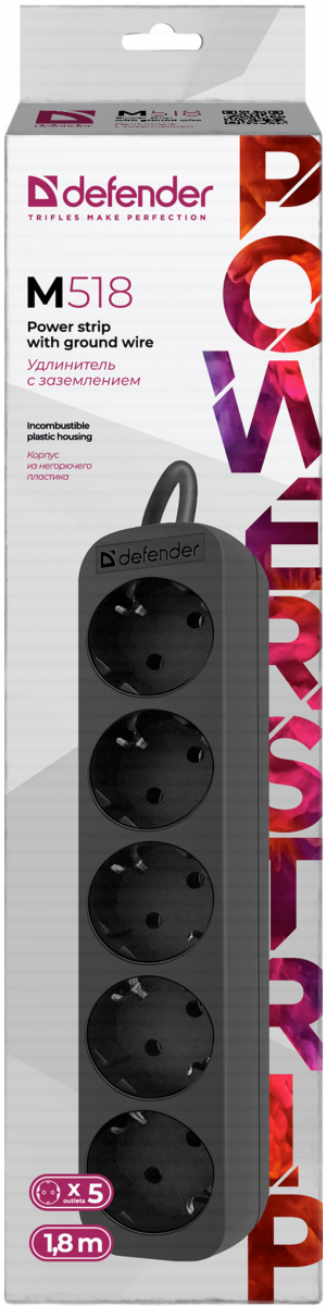 - Удлинитель DEFENDER M518, 5 розеток, ПВС 3*1,0 мм2, мощность 2200 Вт, ток 10А, с/з, черный, 1,8 м (1/45) (99329)