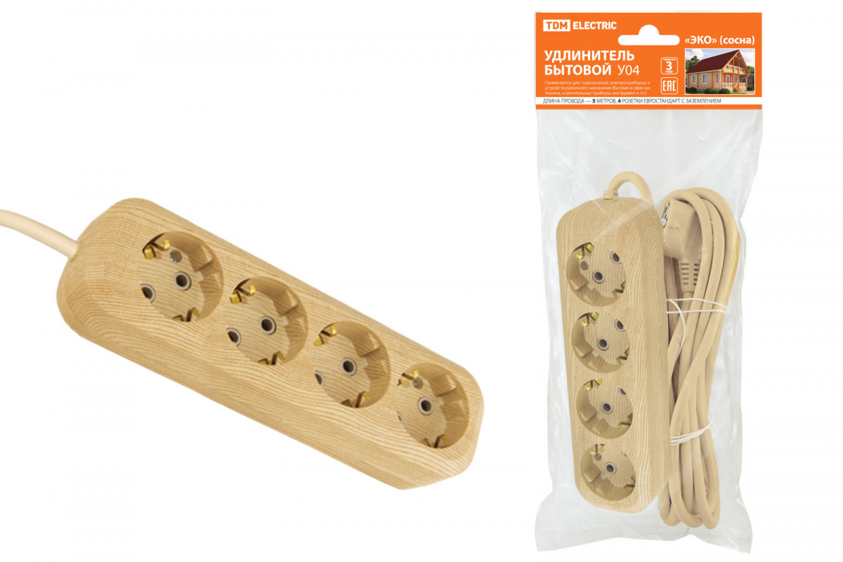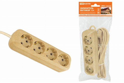 - Удлинитель TDM У04 4 гнезда, 5метров,2П+3, ПВС 3х1мм2 "Эко" (сосна) 16А/250В (1/20) (SQ1303-2012)