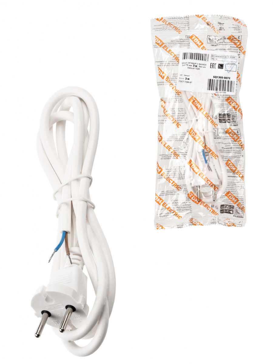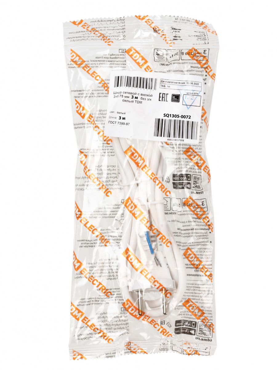 - Шнур сетевой с вилкой ПВС 2x0,75мм2 3м б/з белый TDM (1/30) (SQ1305-0072)