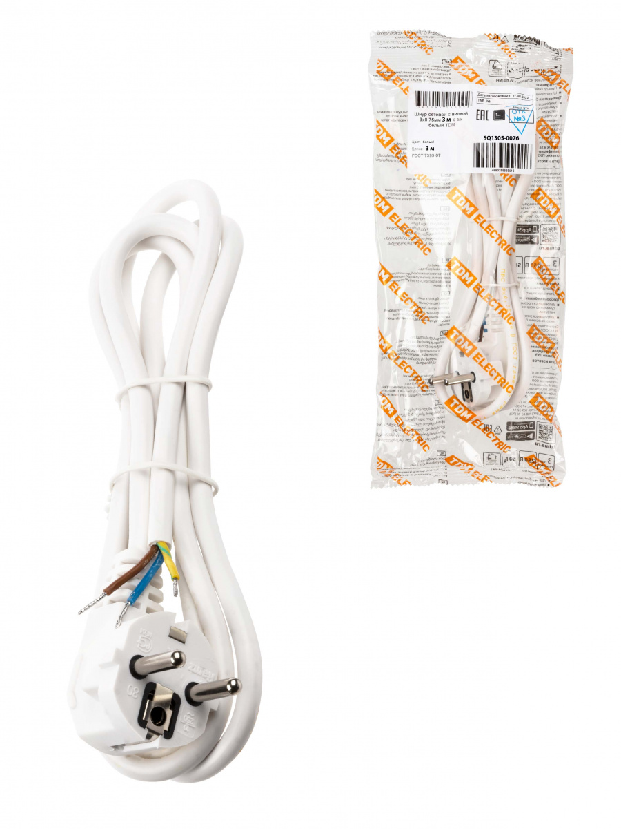 - Шнур сетевой с вилкой ПВС 3x0,75мм2 3м с/з белый TDM (1/25) (SQ1305-0076)