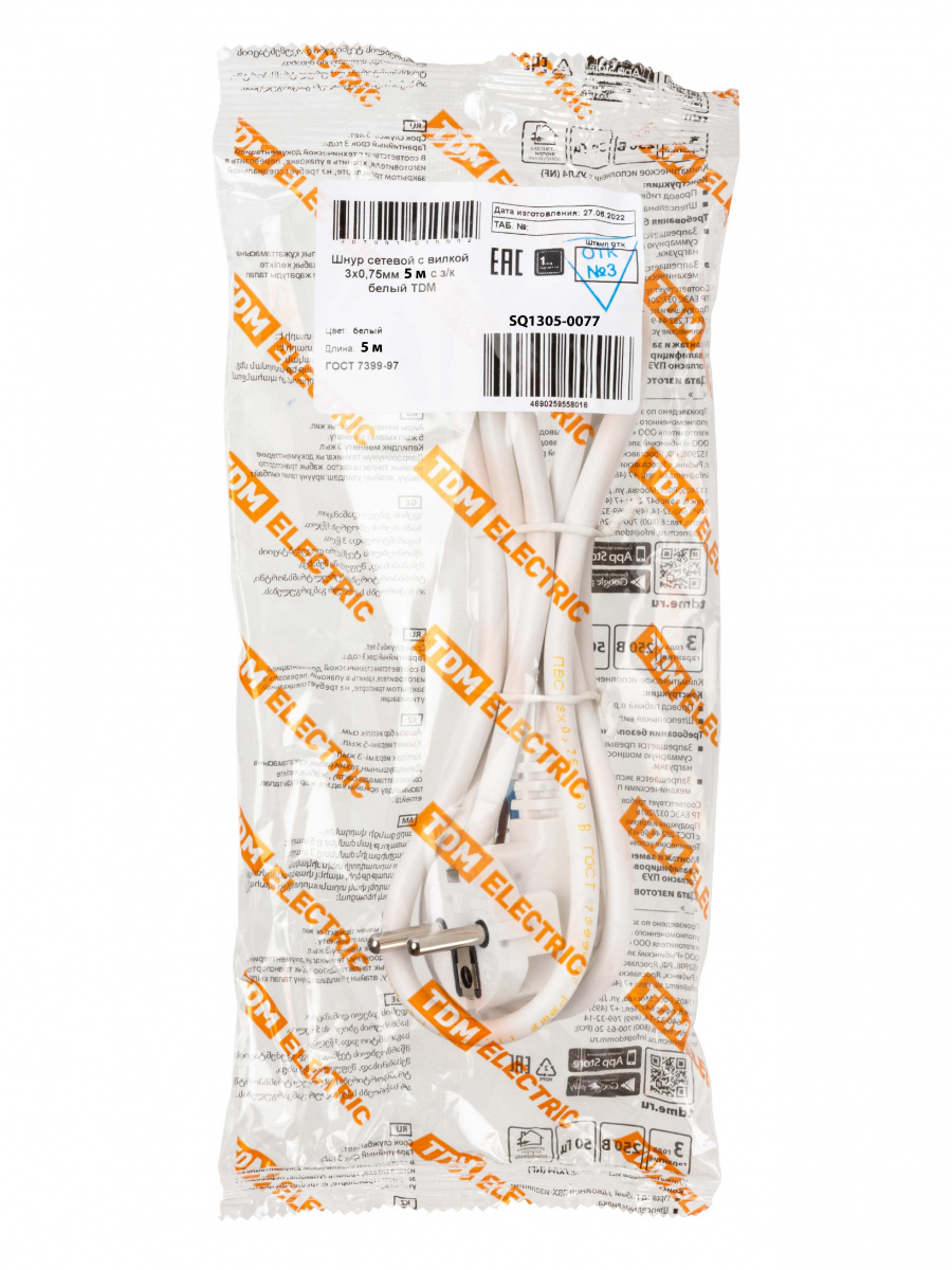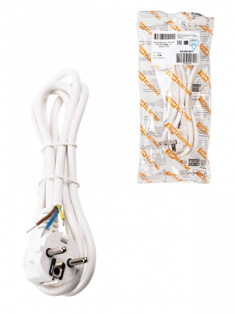 - Шнур сетевой с вилкой ПВС 3x0,75мм2 5м с/з белый TDM (1/30) (SQ1305-0077)