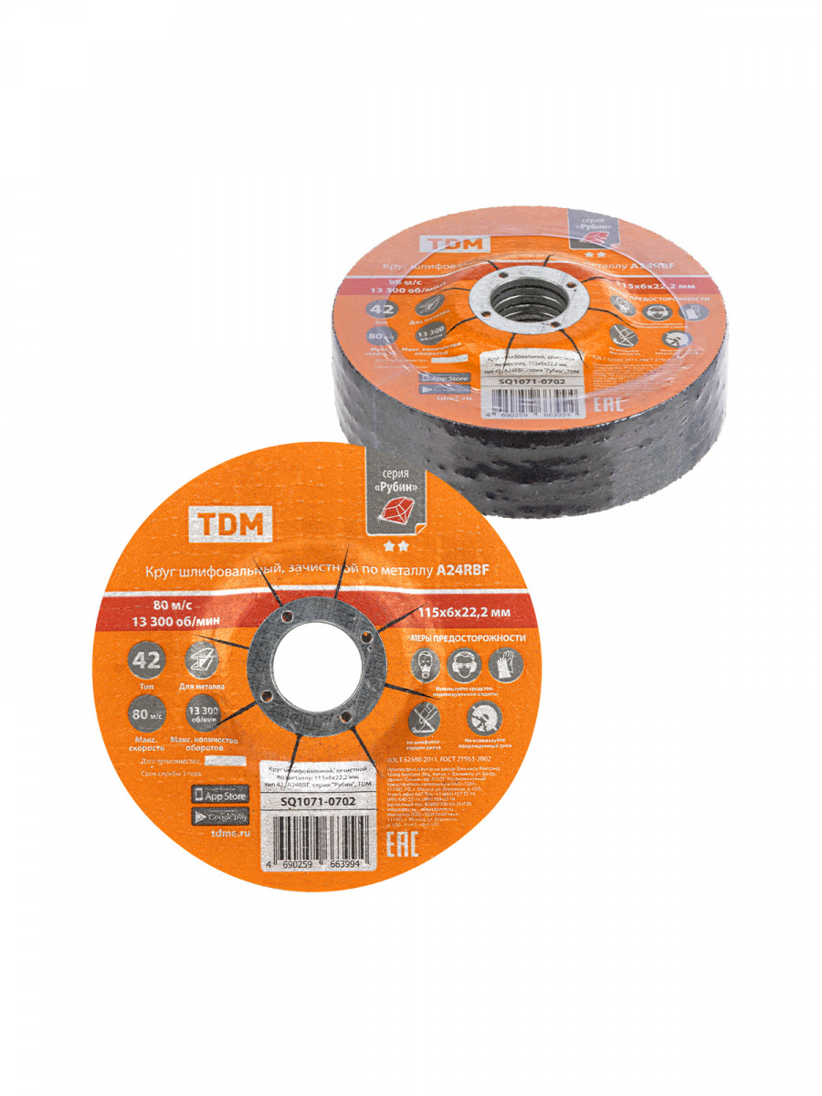 - Круг шлифовальный, зачистной по металлу, 115х6х22,2 мм, тип 42, A24RBF, серия "Рубин", TDM (5/100) (SQ1071-0702)