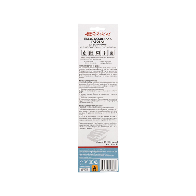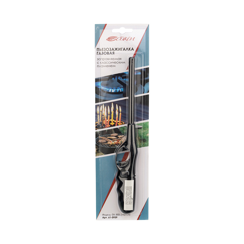 - Бытовая газовая пьезозажигалка с классическим пламенем, многоразовая (1 шт.) черная СК-302L СОКОЛ (1/144) (61-0959)