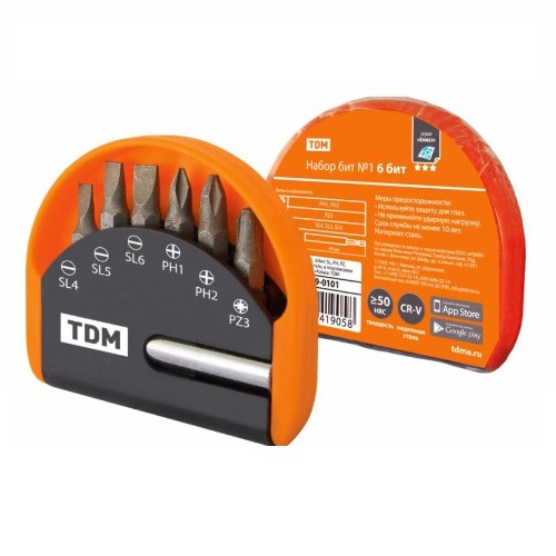 - Набор бит TDM №1, 6 бит: SL, PH , PZ , удлин-ль CR-V сталь, в пласт. держат., «Алмаз» (1/12/144) (SQ1019-0101)