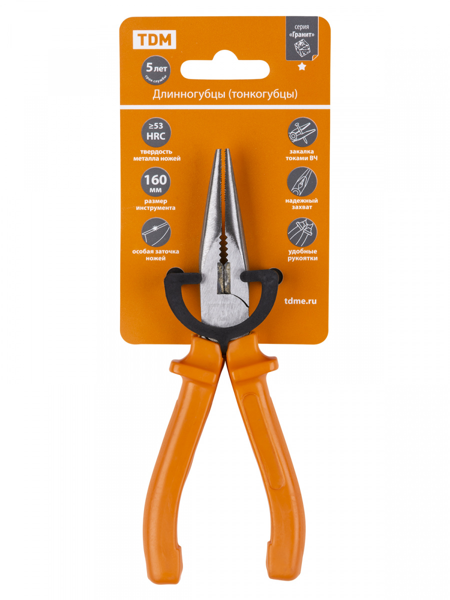 - Длинногубцы (тонкогубцы), с пластиковыми рукоятками, углеродистая сталь, 160 мм, серия "Гранит" TDM (1/60) (SQ1009-0201)