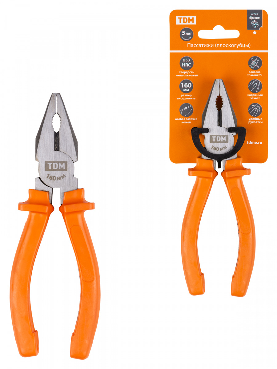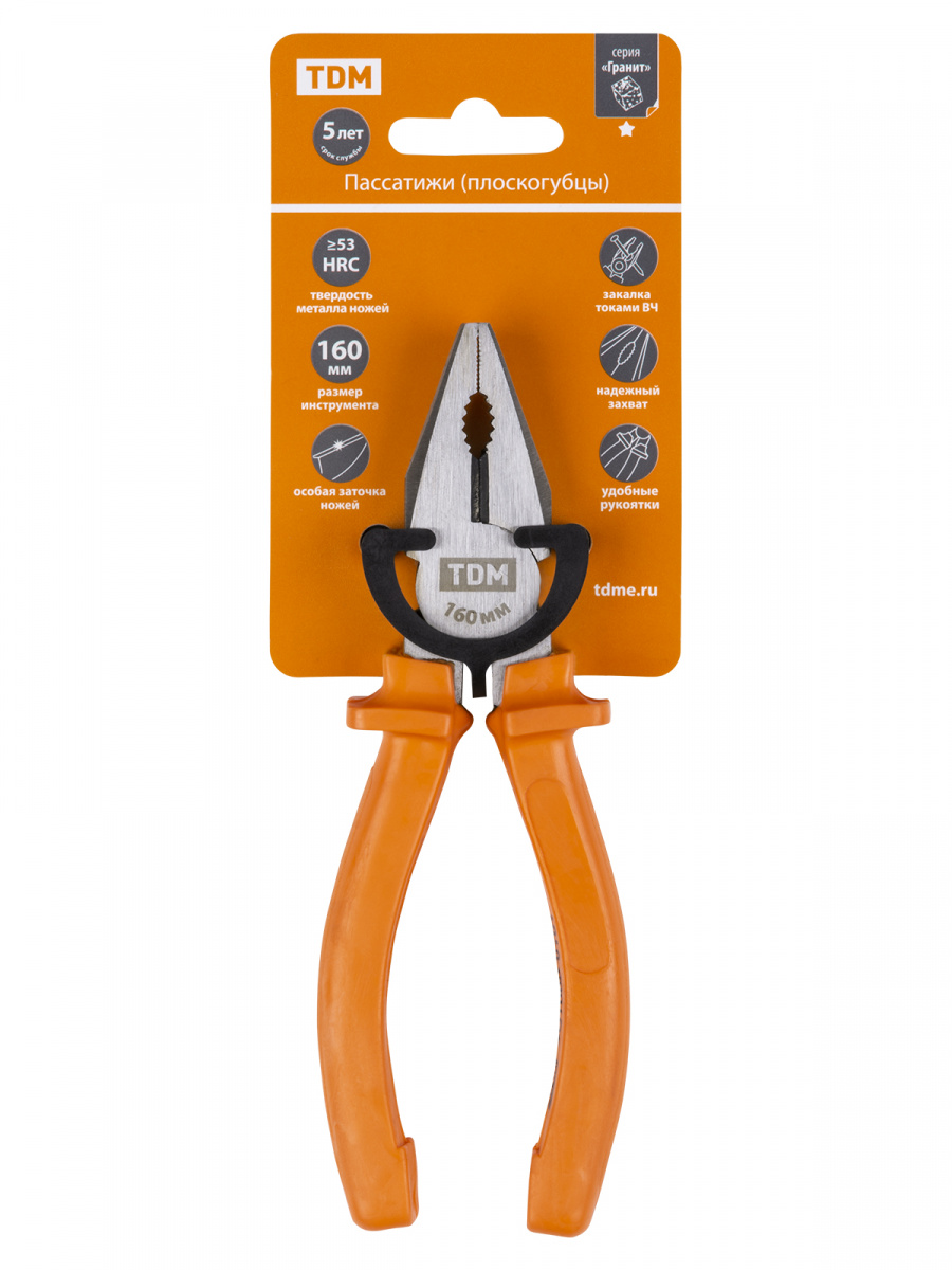 - Пассатижи (плоскогубцы), с пластиковыми рукоятками, углеродистая сталь, 160 мм, серия "Гранит" TDM (1/60) (SQ1009-0101)