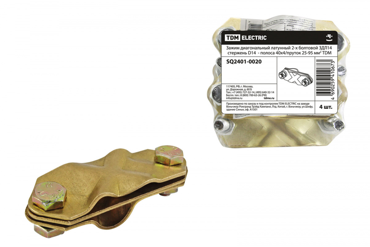 - Зажим диагональный латунный 2-х болтовой ЗДЛ14 стержень D14 - полоса 40х4/пруток 25-95 мм2 TDM (1/4/32) (SQ2401-0020)