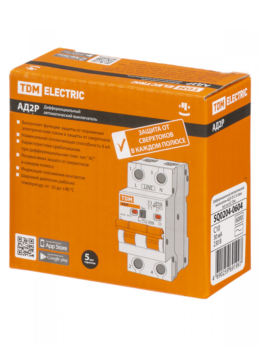- Диф.автомат АД2P 2Р С10 30мА 6кА тип АС TDM (1/48) (SQ0204-0604)