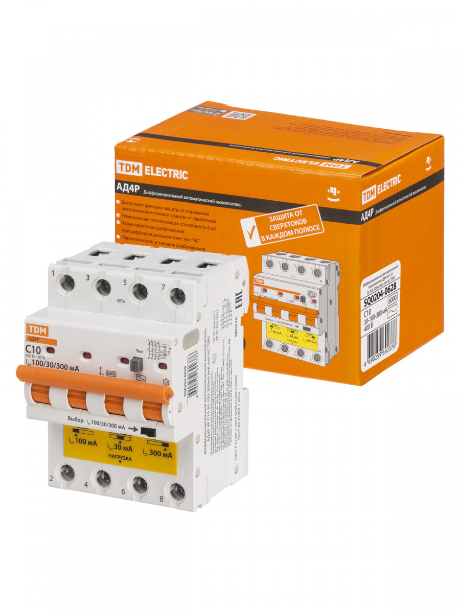 - Диф.автомат АД4P 4Р С10 30-100-300мА 6кА тип АС TDM (1/24) (SQ0204-0628)