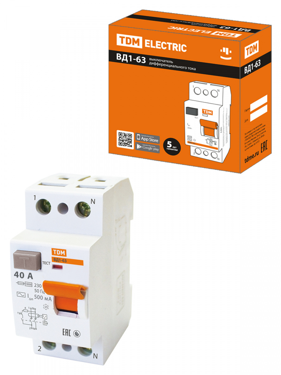 - УЗО TDM ВД1-63 2Р 40А 500мА (1/6/60) (SQ0203-0093)