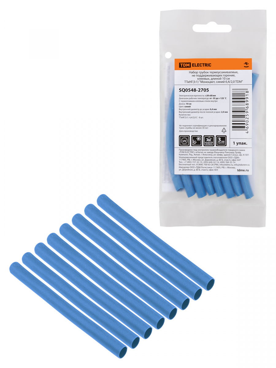 - Набор трубок термоусаживаемых, не поддерживающих горение, клеевых, длиной 10 см ТТкНГ(3:1) "Моноцвет, синий 6,4/2,0 TDM" (1/200) (SQ0548-2705)
