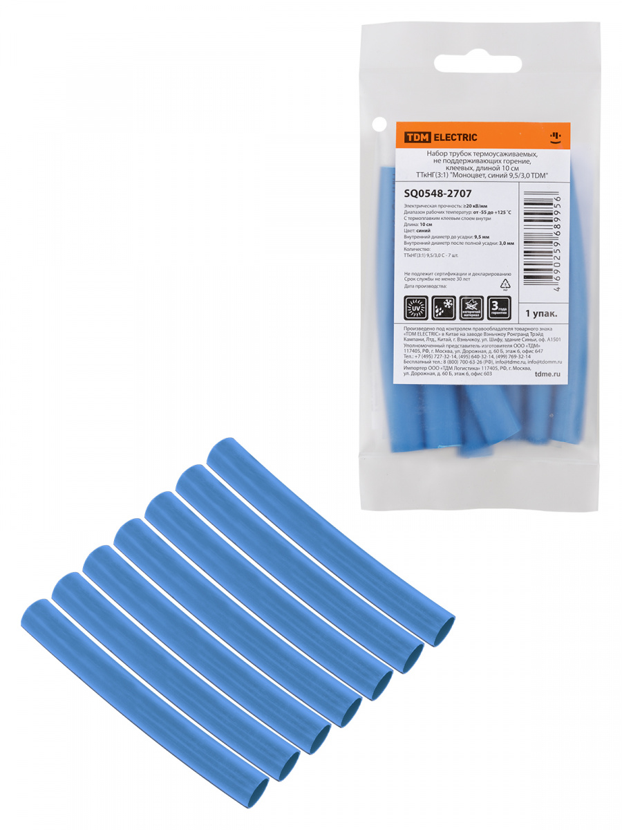 - Набор трубок термоусаживаемых, не поддерживающих горение, клеевых, длиной 10 см ТТкНГ(3:1) "Моноцвет, синий 9,5/3,0 TDM" (1/100) (SQ0548-2707)