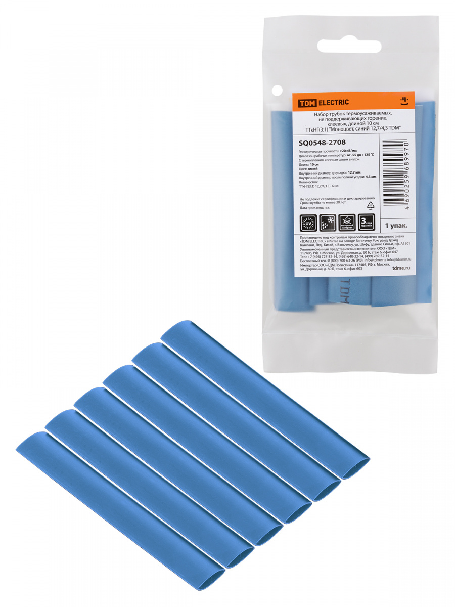 - Набор трубок термоусаживаемых, не поддерживающих горение, клеевых, длиной 10 см ТТкНГ(3:1) "Моноцвет, синий 12,7/4,3 TDM" (1/100) (SQ0548-2708)
