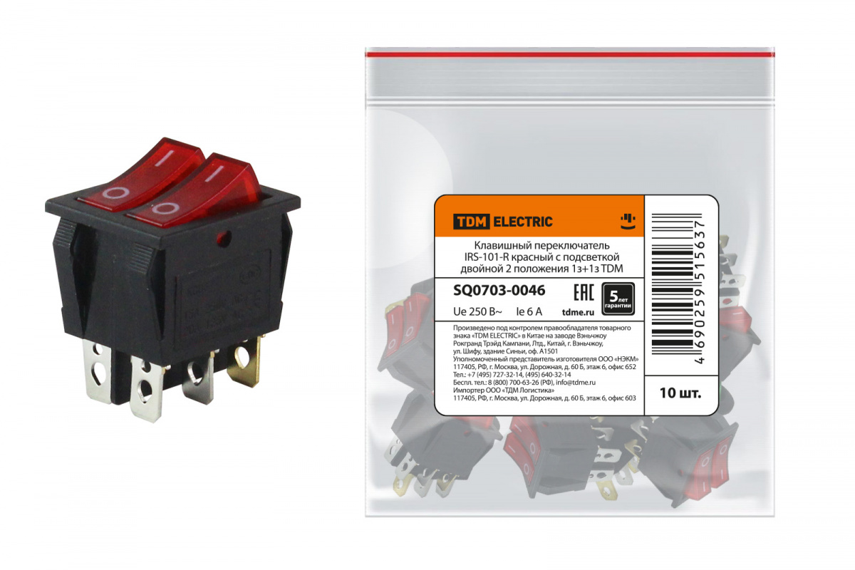 - Клавишный переключатель IRS-101-R красный с подсветкой двойной 2 положения 1з+1з TDM (1/10/1600) (SQ0703-0046)