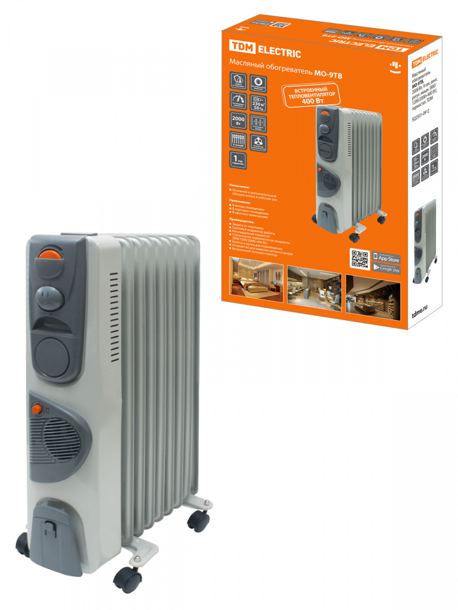 - Масляный обогреватель МО-9ТВ, 2000 Вт, 9 сек, вент, регул. мощн. (800/1200/2000+400 Вт), термостат, TDM (1) (SQ2501-0912)